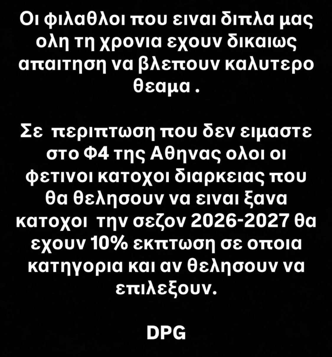 Συγκεκριμένα, τόνισε πως αν ο Παναθηναϊκός δεν βρεθεί στο Final Four που θα διεξαχθεί στο T-Center της Αθήνας, τότε όλοι οι φετινοί κάτοχοι εισιτηρίων διαρκείας που επιθυμούν να ανανεώσουν για τη σεζόν 2026-2027 θα λάβουν έκπτωση 10% σε οποιαδήποτε κατηγορία επιλέξουν.