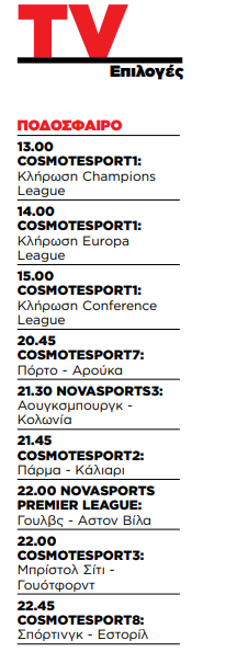 Το βράδυ, το ενδιαφέρον στρέφεται στα ευρωπαϊκά πρωταθλήματα. Στις 20.45 η Πόρτο αντιμετωπίζει την Αρούκα (COSMOTE Sport 7), ενώ στις 21.30 η Άουγκσμπουργκ φιλοξενεί την Κολωνία (Novasports 3).