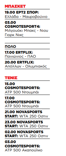 Το πρόγραμμα ολοκληρώνεται στις 03.00 με το ATP 500 στο Ακαπούλκο (COSMOTE Sport 6).