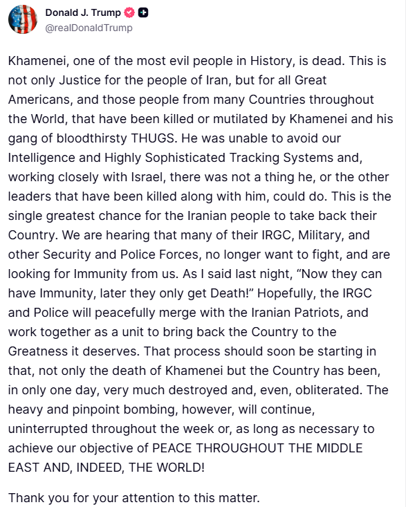 «Ο Χαμενεΐ, ένας από τους πιο διαβολικούς ανθρώπους στην ιστορία, είναι νεκρός. Αυτό δεν είναι μόνο δικαιοσύνη για τον λαό του Ιράν, αλλά και για όλους τους μεγάλους Αμερικανούς και τους ανθρώπους από πολλές χώρες σε όλο τον κόσμο, που έχουν σκοτωθεί ή ακρωτηριαστεί από τον Χαμενεΐ και τη συμμορία του αιμοδιψών ΤΡΑΜΠΟΥΚΩΝ. Δεν μπόρεσε να αποφύγει τις μυστικές υπηρεσίες μας και τα εξαιρετικά εξελιγμένα συστήματα εντοπισμού μας και, σε στενή συνεργασία με το Ισραήλ, δεν υπήρχε τίποτα που να μπορούσε να κάνει αυτός ή οι άλλοι ηγέτες που σκοτώθηκαν μαζί του.