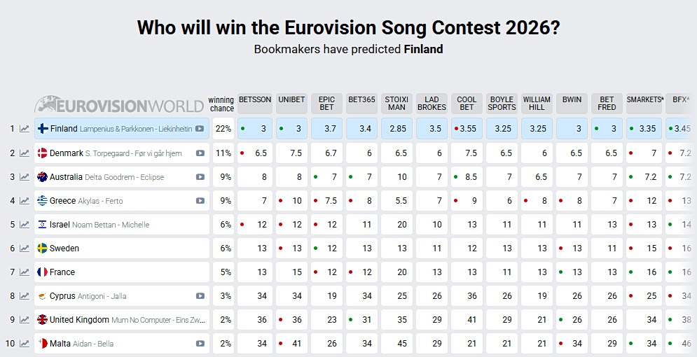 Στην αντίπερα όχθη, η Φινλανδία δείχνει να παίζει χωρίς αντίπαλο στην παρούσα φάση. Με το κομμάτι «Liekinheitin» να έχει κερδίσει τις εντυπώσεις μετά την πρόσφατη επιλογή του, η χώρα απολαμβάνει την 1η θέση με ποσοστό 21% και αποδόσεις που ξεκινούν από 2,8.