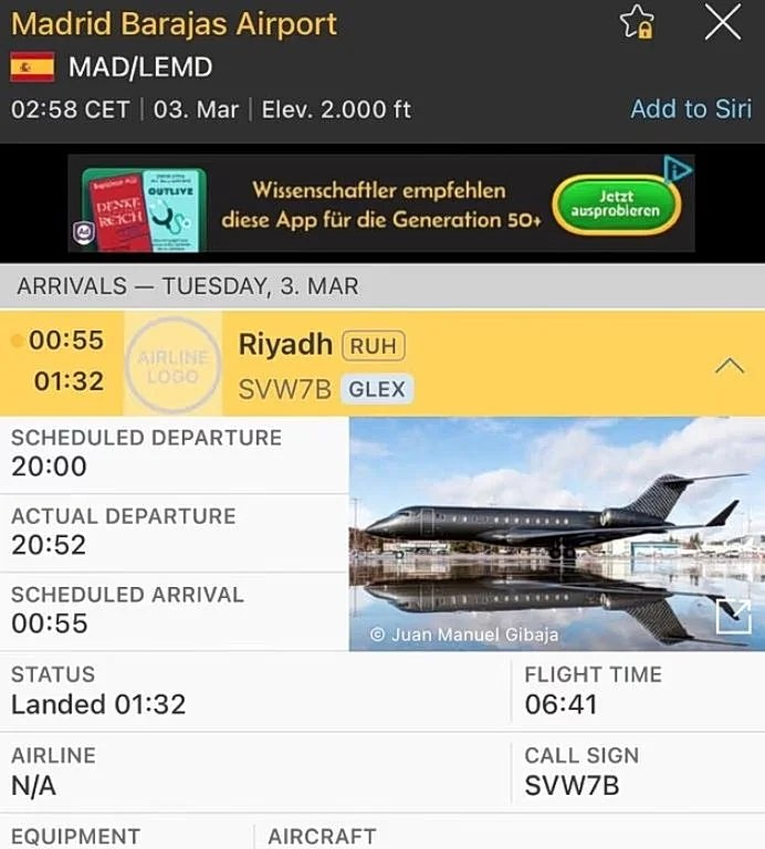 Σύμφωνα με στοιχεία παρακολούθησης πτήσεων, το Bombardier Global Express πραγματοποίησε πτήση διάρκειας περίπου επτά ωρών με προορισμό τη Μαδρίτη. Το αεροσκάφος απογειώθηκε στις 20:20 και προσγειώθηκε λίγο πριν τη 01:00 τα ξημερώματα.