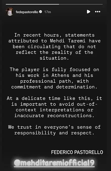 Ο ατζέντης του Μεχντί Ταρέμι, Φεντερίκο Παστορέλο, τοποθετήθηκε δημόσια μέσω social media, λίγη ώρα μετά την ανάρτηση του αντιπροέδρου της Ολυμπιακού για τα «fake news».