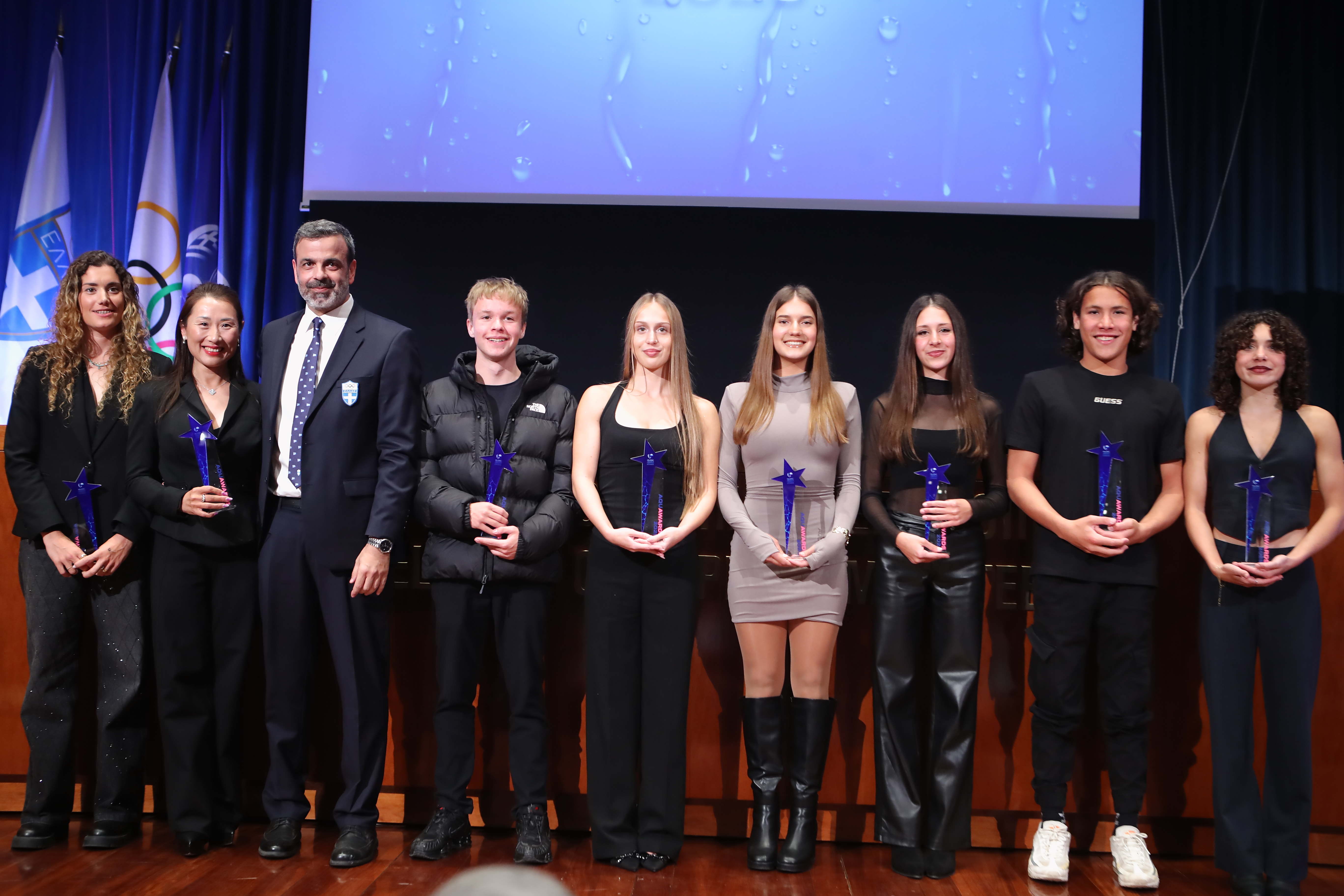 Απονομές έκαναν: Ο Υπουργός Αθλητισμού Γιάννης Βρούτσης, ο Πρόεδρος της ΚΟΕ Κυριάκος Γιαννόπουλος, ο Πρόεδρος της ΕΟΕ Ισίδωρος Κούβελος, ο Σπύρος Καπράλος μέλος του εκτελεστικού συμβουλίου της ΔΟΕ και Πρόεδρος των Ευρωπαϊκών Ολυμπιακών Επιτροπών, ο Διευθύνων της χορηγού Stoiximan Νίκος Φλίγκος, ο Δήμαρχος Βόλου Αχιλλέας Μπέος (που φιλοξενεί κάθε χρόνο τις Εθνικές μας ομάδες για προετοιμασία στις κολυμβητικές εγκαταστάσεις του δήμου), η Αντιπεριφερειάρχης Αττικής Κεφαλογιάννη, ο Α’ Αντιπρόεδρος της ΚΟΕ Γιώργος Αφρουδάκης, ο πρόεδρος της Ολυμπιακής Λαμπαδηδρομίας Θωμάς Τόκας, το μέλος της ΕΟΕ Κωνσταντίνος Λιαρομάτης, η Γ’ Αντιπρόεδρος της ΚΟΕ Αλεξία Μαρίνη, ο πρόεδρος και διευθύνων σύμβουλος της Arena Αλέξης Χατζόπουλος, ο Αντιπτέραρχος Γιάννης Φάκας εκπρόσωπος ΓΕΕΘΑ, η Ταγματάρχης Ανδριάννα Αγάθη εκπρόσωπος ΓΕΣ, η ειδική γραμματέας της ΚΟΕ Δέσποινα Καράμπελα, η επικεφαλής μαζικού αθλητισμού ΟΠΑΝΔΑ Βίκυ Τρομπέτα, η Πρόεδρος του ΕΑΠΚΟΧ Εύη Μωραϊτίδου, η πρώην πρωταθλήτρια κολύμβησης Ελένη Βρεττού, η πρόεδρος της ΕΣΟΑ Βούλα Κοζομπόλη, η Ταμίας του ΕΑΚΝ Αγ. Κοσμά Γεωργία Ελληνάκη, η Β’ Αντιπρόεδρος της ΚΟΕ Ελευθερία Σαραντίδου, ο συντονιστής διευθυντής του ΟΑΚΑ Κωνσταντίνος Χαλιορής, η Πένη Κονιτσιώτη αντιπρόεδρος ΟΑΚΑ, ο Νίκος Ξυλούρης μέλος ΔΣ ΚΟΕ και ΕΟΕ, ο Νίκος Γέμελος εντεταλμένος σύμβουλος Αθλητισμού δήμου Πειραιά και μέλος ΔΣ ΚΟΕ, ο Θοδωρής Μουστακαρίας και ο Ηλίας Ξιάρχος μέλη ΔΣ ΚΟΕ, η Μαρίνα Κουταρέλη CO Communications Lab, ο Β’ Αντιπρόεδρος της ΚΟΕ Ηλίας Μάλαμας, Γενικός Γραμματέας της ΚΟΕ Δημήτρης Κύρκος ο Στέφανος Αυγουλέας μέλος ΔΣ ΚΟΕ.