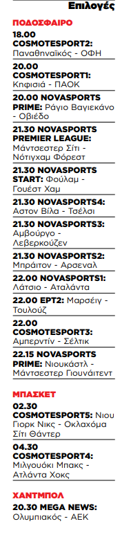 Αργότερα, ξεχωρίζουν οι αναμετρήσεις Λάτσιο – Αταλάντα (22.00, NOVASPORTS1), Μαρσέιγ – Τουλούζ (22.00, ΕΡΤ2), Αμπερντίν – Σέλτικ (22.00, COSMOTESPORT3) και Νιουκάστλ – Μάντσεστερ Γιουνάιτεντ (22.15, NOVASPORTS PRIME).