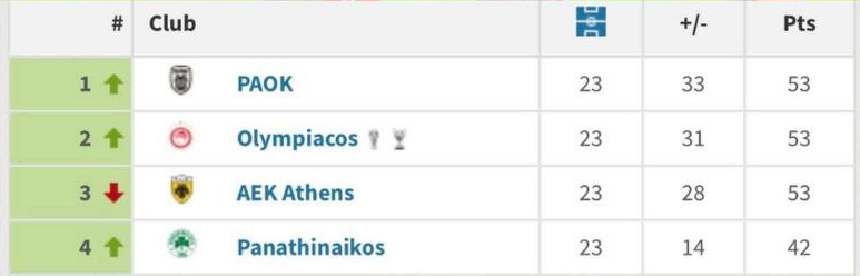 Βελτιωμένη είναι και η ΑΕΚ, που πέρσι στο ίδιο σημείο της χρονιάς είχε 49 βαθμούς, ενώ τώρα έχει φτάσει επίσης στους 53. Την προηγούμενη σεζόν μάλιστα ακολούθησε ένα αρνητικό σερί που την έφερε τελικά στην τέταρτη θέση των play off.