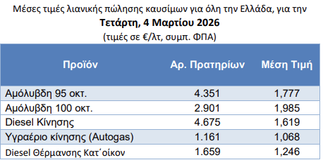 Με μικρές διακυμάνσεις συνεχίζεται η διάθεση των καυσίμων στην εγχώρια αγορά. Σύμφωνα με τα τελευταία στοιχεία (της Τετάρτης 04/06/26) από το καθημερινό δελτίο επισκόπησης τιμών, η μέση πανελλαδική τιμή για την Αμόλυβδη 95 οκτανίων διαμορφώθηκε στα 1,777 ευρώ ανά λίτρο.