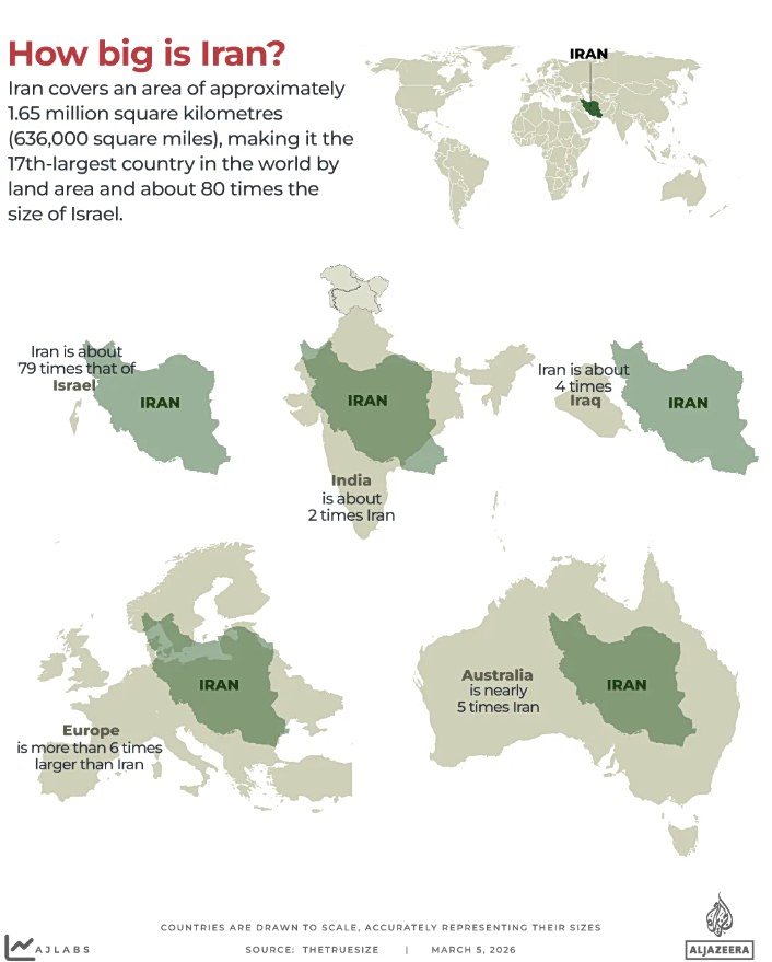 Το Ιράν αποτελεί τη 17η μεγαλύτερη χώρα στον κόσμο σε έκταση, ακριβώς πίσω από το Σουδάν και τη Λιβύη, καλύπτοντας περίπου 1,65 εκατομμύρια τετραγωνικά χιλιόμετρα. Βρίσκεται στη Δυτική Ασία και μοιράζεται χερσαία σύνορα με επτά χώρες: το Ιράκ, το Τουρκμενιστάν, το Αφγανιστάν, το Πακιστάν, το Αζερμπαϊτζάν, την Τουρκία και την Αρμενία.
