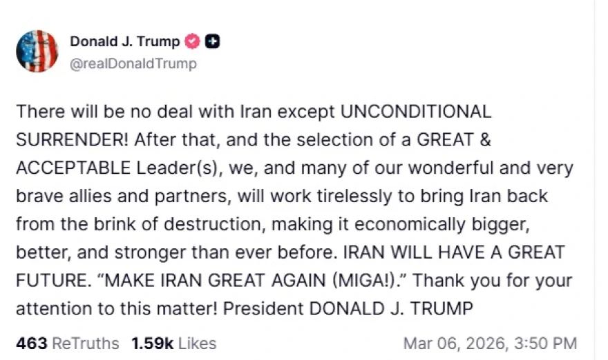 Επίσης, ο Αμερικανός πρόεδρος ξεκαθάρισε ότι το μόνο που μπορεί να αποδεχθεί είναι μια «παράδοση άνευ όρων», τονίζοντας πως στη συνέχεια θα πρέπει να ακολουθήσει η επιλογή του νέου ηγέτη ή ομάδας ηγετών της χώρας, οι οποίοι θα καλύψουν το κενό που άφησε ο θάνατος του Ανώτατου Θρησκευτικού ηγέτη Αγιατολάχ Αλί Χαμενεϊ.