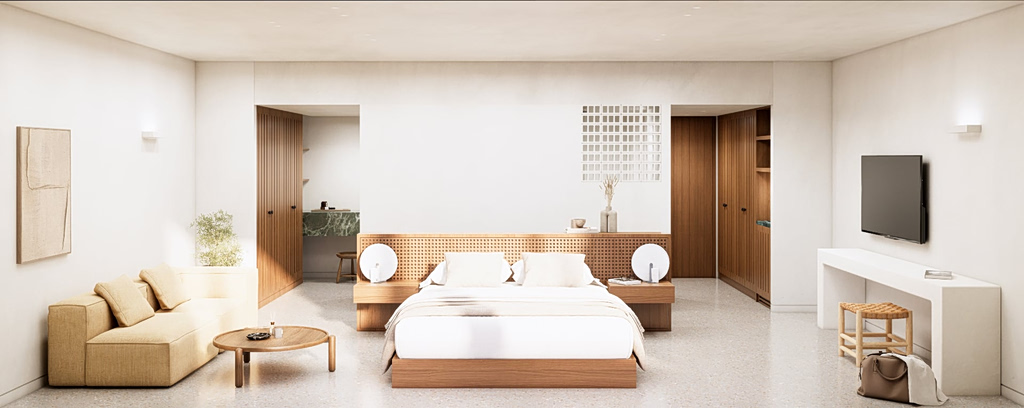 Τη σχεδιαστική επιμέλεια, τηυν αρχιτεκτονική μελέτη και την επίβλεψη της αναδημιουργίας του ξενοδοχείου ανέλαβε το διακεκριμένο αρχιτεκτονικό γραφείο Tsolakis Architects. Θεμελιώδη άξονα του επανασχεδιασμού αποτέλεσε η ενσωμάτωση της τοπικότητας. Υλικά όπως μάρμαρο, πέτρα και ξύλο, όλα με άμεση αναγωγή στην ιστορία της Τήνου, συνθέτουν ένα περιβάλλον που παραμένει αυθεντικό και διαχρονικό.