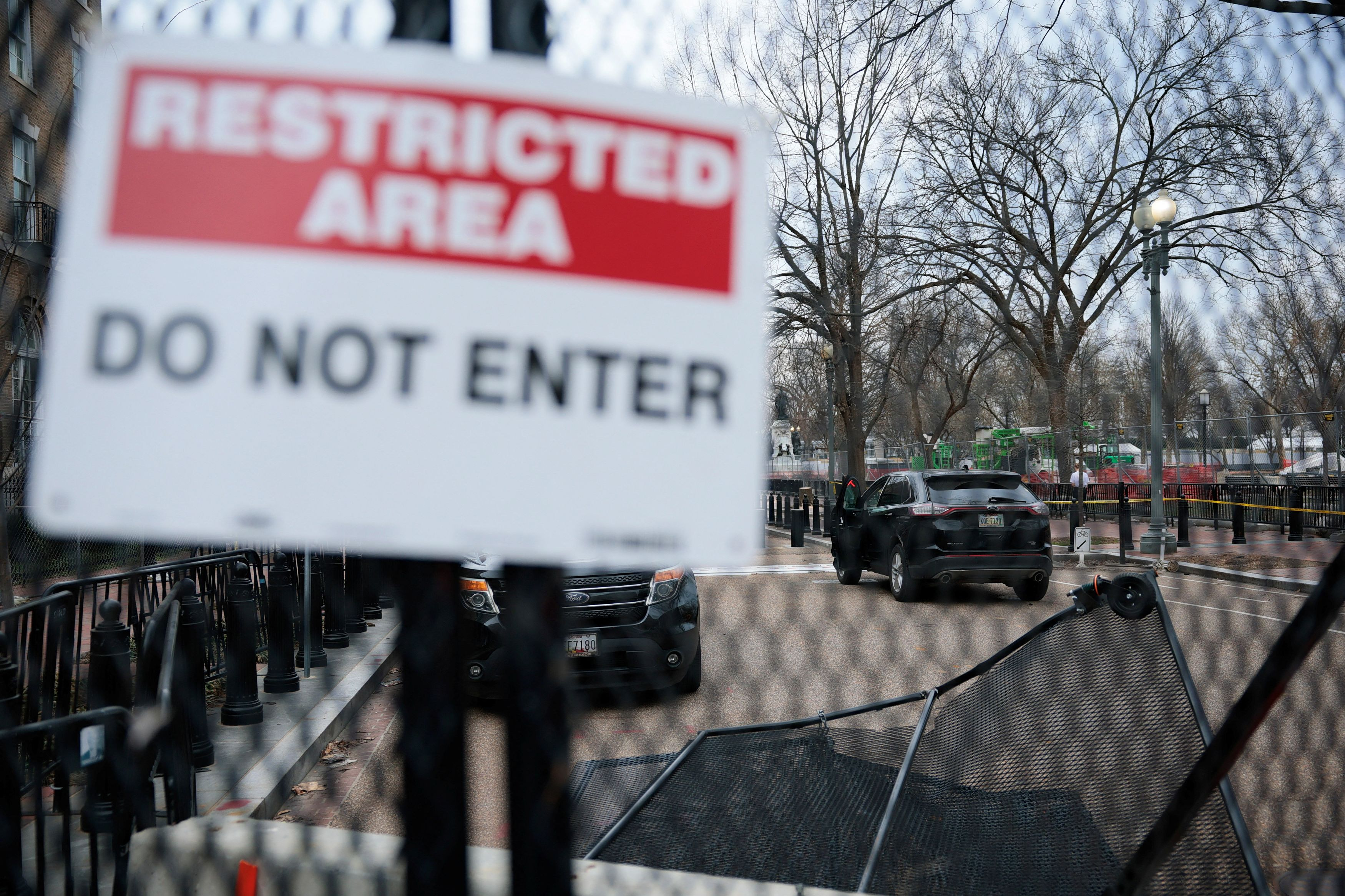 A fence is seen knocked over after a vehicle drove through a Secret Service barricade outside the White House in Washington, D.C., U.S., March 11, 2026. REUTERS/Evan Vucci