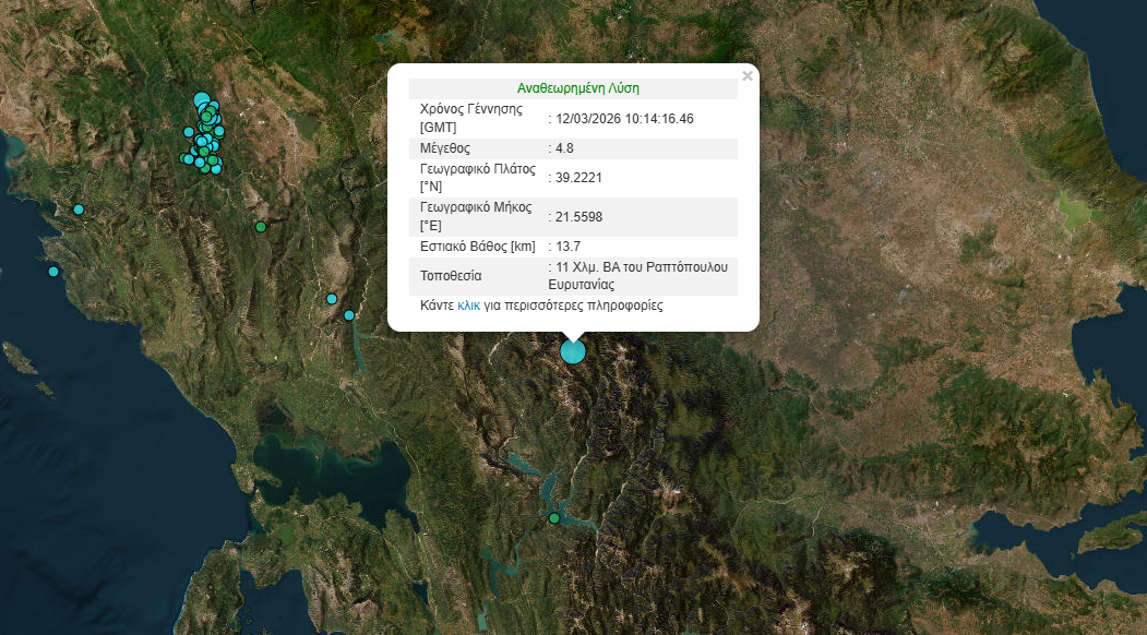 Σεισμός μεγέθους 4,8 βαθμών σημειώθηκε το πρωί της Πέμπτης 12 Μαρτίου 2026, στις 12:14, σύμφωνα με τα δεδομένα του Γεωδυναμικού Ινστιτούτου.