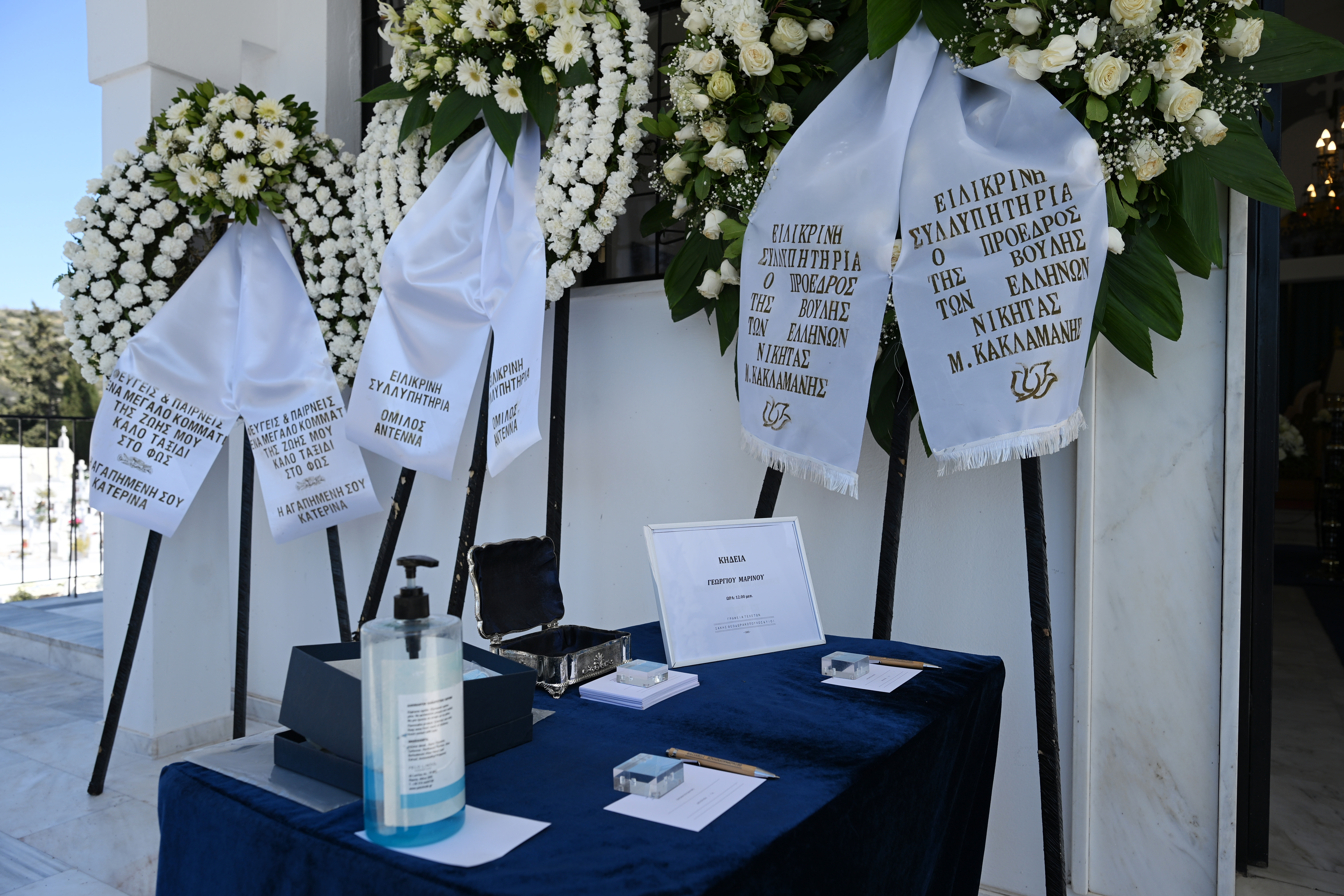 Στο ναό του Αγίου Ανδρέα στο Κοιμητήριο της Βούλας μεταφέρθηκε η σορός του Γιώργο Μαρίνου λίγο πριν τις 11:00 το πρωί. Η εξόδιος ακολουθία αναμένεται να ξεκινήσει στις 12:00.
