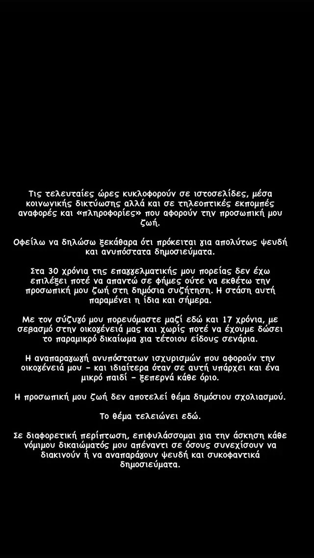 «Τις τελευταίες ώρες κυκλοφορούν σε ιστοσελίδες, μέσα κοινωνικής δικτύωσης αλλά και σε τηλεοπτικές εκπομπές αναφορές και “πληροφορίες” που αφορούν την προσωπική μου ζωή. Οφείλω να δηλώσω ξεκάθαρα ότι πρόκειται για απολύτως ψευδή και ανυπόστατα δημοσιεύματα» αναφέρει η ίδια.