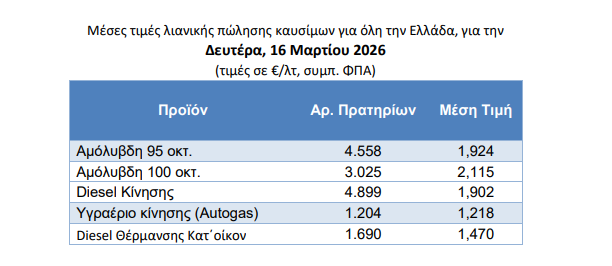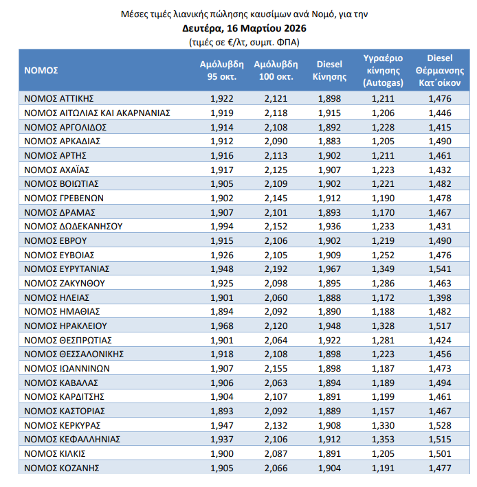 Ακόμη πιο επιβαρυμένη εμφανίζεται η εικόνα για την αμόλυβδη 100 οκτανίων, η οποία έχει ξεπεράσει το όριο των 2 ευρώ, αγγίζοντας τα 2,115 ευρώ το λίτρο. Το Diesel κίνησης ακολουθεί με μέση τιμή 1,902 ευρώ το λίτρο, γεγονός που επηρεάζει άμεσα το μεταφορικό κόστος των προϊόντων και την τελική τιμή τους στην αγορά.