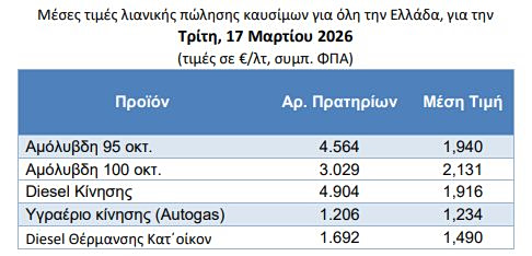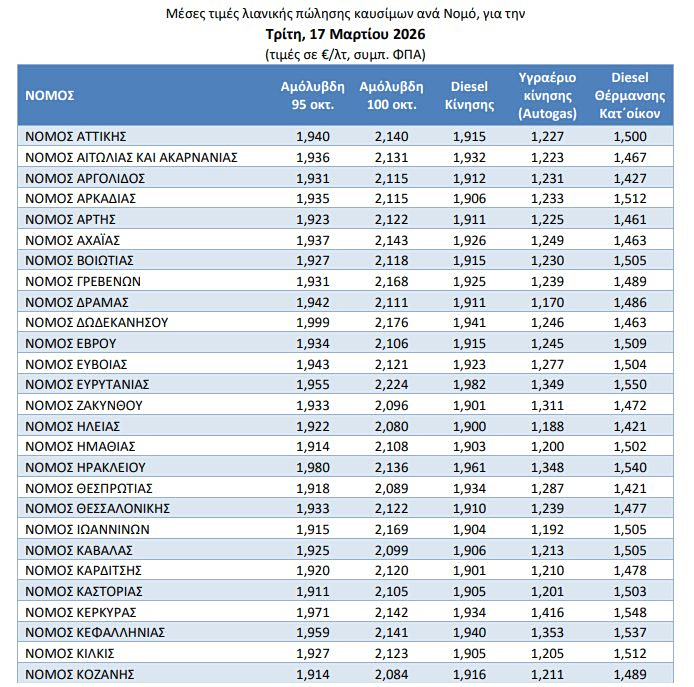 Σε νέα επίπεδα διαμορφώθηκαν οι τιμές των υγρών καυσίμων στην ελληνική επικράτεια, σύμφωνα με τα τελευταία στοιχεία από το Παρατηρητήριο Τιμών Καυσίμων. Για την Τρίτη 17 Μαρτίου, η μέση τιμή της αμόλυβδης 95 οκτανίων ανήλθε στα 1,940 €/λτ., καταγράφοντας μια σταθερή ανοδική τάση τις τελευταίες ημέρες.