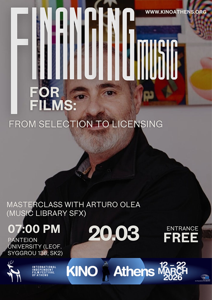 «Χρηματοδότηση Μουσικής για Ταινίες: Από την Επιλογή έως την Άδεια Χρήσης», την Παρασκευή 20/3 στις 7 μ.μ., από τον Αρτούρο Ολέα, Music Library SFX (Νέο κτιριο, αίθουσα Σάκη Καράγιωργα 2).