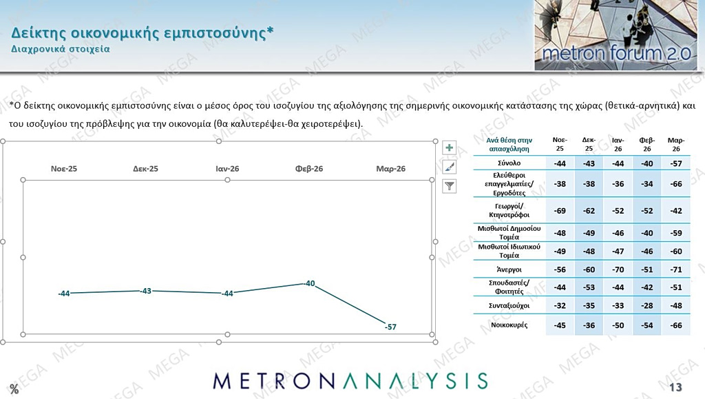 Η δημοσκόπηση δείχνει ότι υπάρχει πολύ σημαντική υποχώρηση, καθώς από το -40% τον προηγούμενο μήνα υποχωρεί στο -57%, πράγμα που σημαίνει ότι στο φόντο των τελευταίων εξελίξεων οι πολίτες προεξοφλούν σημαντική επιδείνωση της οικονομικής κατάστασης. Ιδιαίτερο ενδιαφέρον ότι τη μεγαλύτερη ανησυχία επιδεικνύουν όσοι είναι ελεύθεροι επαγγελματίας ή εργοδότες, δηλαδή μια κοινωνική κατηγορία παραδοσιακά φιλική προς το κυβερνών κόμμα.