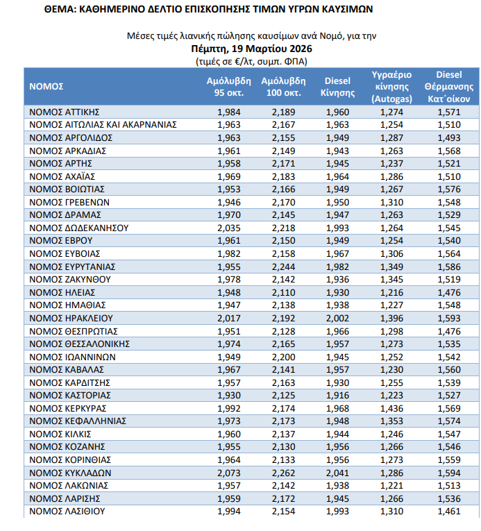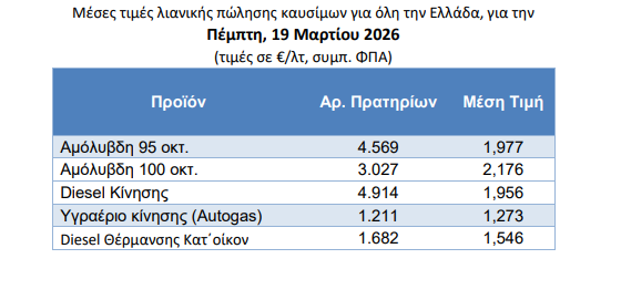 Για την Πέμπτη 19 Μαρτίου, η μέση τιμή της αμόλυβδης 95 οκτανίων ανήλθε στα 1,977 €/λτ., καταγράφοντας μια σταθερή ανοδική τάση τις τελευταίες ημέρες.
