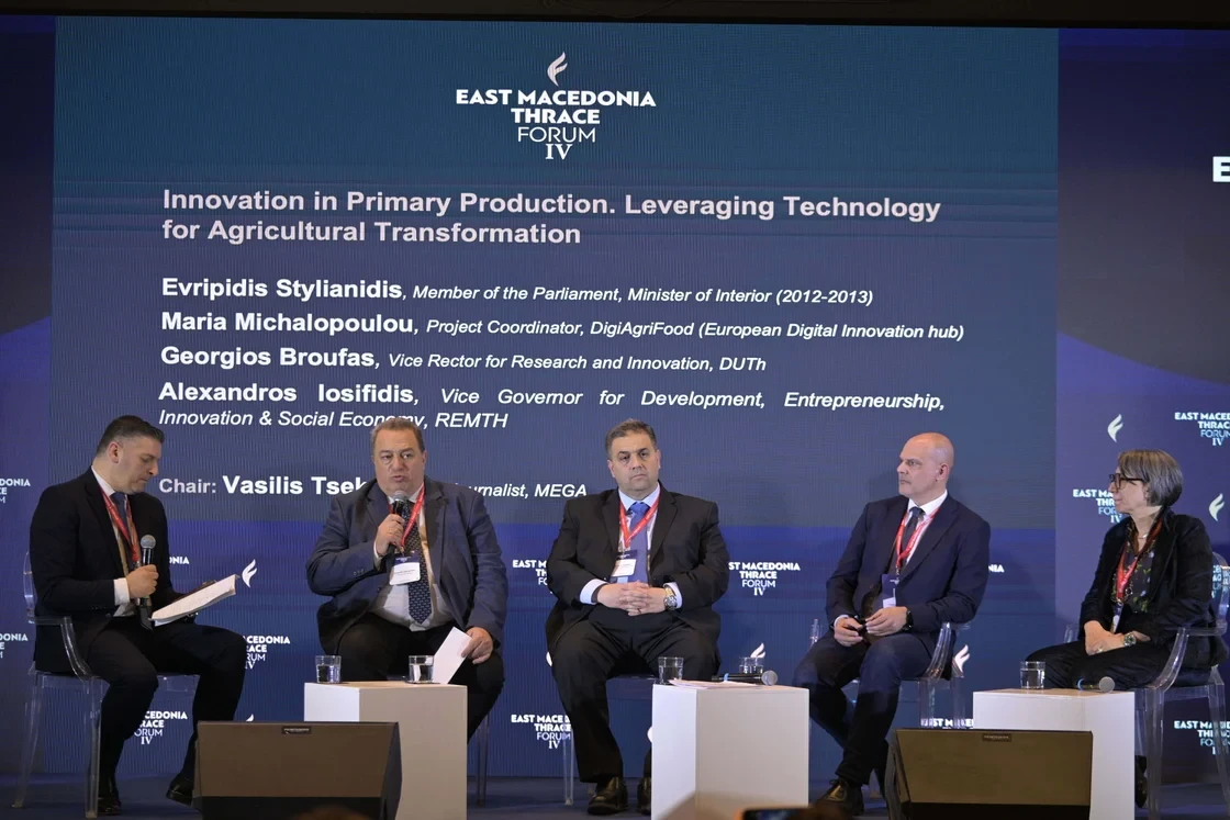 Από αριστερά: Βασίλης Τσεκούρας, Δημοσιογράφος, Mega – Ευριπίδης Στυλιανίδης, Βουλευτής και πρώην Υπουργός Εσωτερικών – Αλεξανδρος Ιωσιφίδης, Αντιπεριφερειάρχης Ανάπτυξης, Καινοτομίας και Κοινωνικής Οικονομίας Ανατολικής Μακεδονίας και Θράκης – Γεώργιος Μπρούφας, Αντιπρύτανης για την Έρευνα και Καινοτομία του Δημοκρίτειου Πανεπιστημίου Θράκης – Μαρία Μιχαλοπούλου, Project Coordinator, DigiAgriFood (European Digital Innovation hub)
