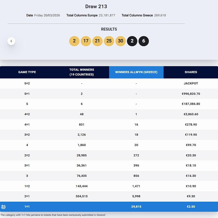 Πραγματοποιήθηκε σήμερα Παρασκευή (20/3), η κλήρωση 213 του Eurojackpot που μοιράζει 40.000.000 ευρώ στους νικητές της πρώτης κατηγορίας.