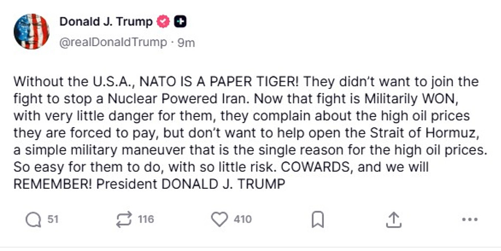 «Χωρίς τις ΗΠΑ, το ΝΑΤΟ ΕΙΝΑΙ ΜΙΑ ΧΑΡΤΙΝΗ ΤΙΓΡΗ! Δεν ήθελαν να συμμετάσχουν στον αγώνα για να σταματήσουν ένα πυρηνικό Ιράν. Τώρα που η μάχη ΚΕΡΔΗΘΗΚΕ στρατιωτικά, με πολύ μικρό κίνδυνο για αυτούς, παραπονιούνται για τις υψηλές τιμές πετρελαίου που αναγκάζονται να πληρώσουν, αλλά δεν θέλουν να βοηθήσουν στο άνοιγμα του Στενού του Ορμούζ, έναν απλό στρατιωτικό ελιγμό που είναι ο μοναδικός λόγος για τις υψηλές τιμές του πετρελαίου. Τόσο εύκολο για αυτούς να το κάνουν, με τόσο μικρό κίνδυνο. ΔΕΙΛΟΙ, και θα το θυμόμαστε! Πρόεδρος ΝΤΟΝΑΛΝΤ ΤΖ. ΤΡΑΜΠ