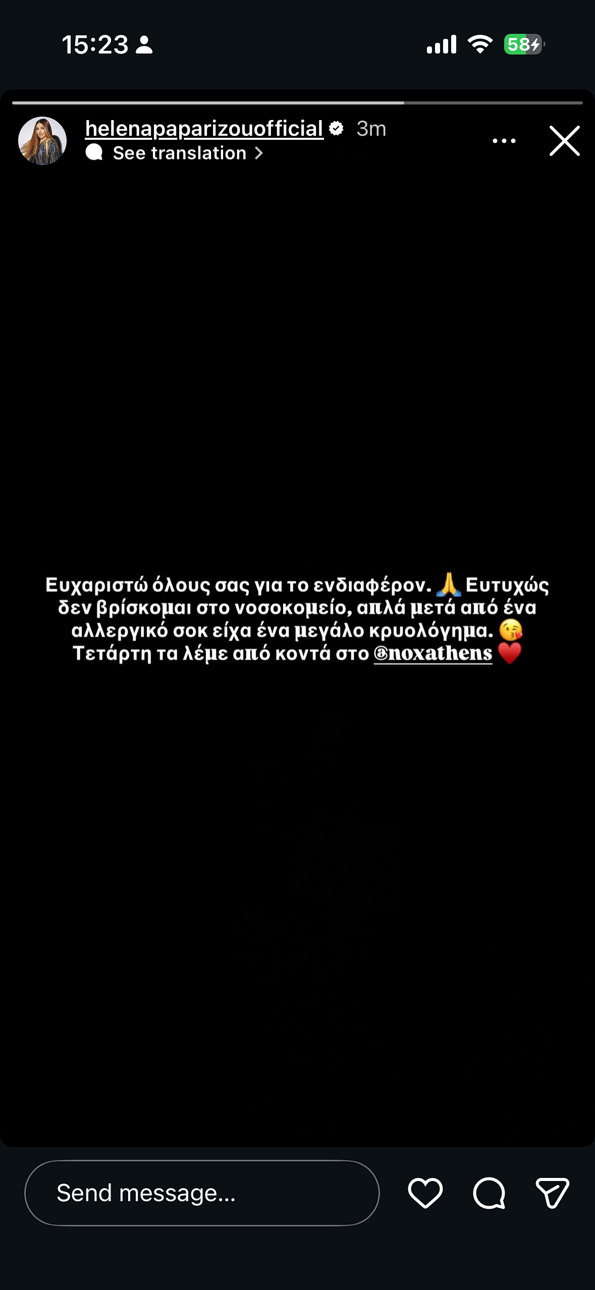 Τις τελευταίες ώρες, κυκλοφόρησαν πληροφορίες που ανέφεραν ότι η Έλενα Παπαρίζου νοσηλεύεται εκ νέου. Ωστόσο, η ίδια έβαλε τέλος στα σενάρια με ένα story, όπου ξεκαθάρισε ότι δεν υπάρχει κανένας λόγος ανησυχίας.