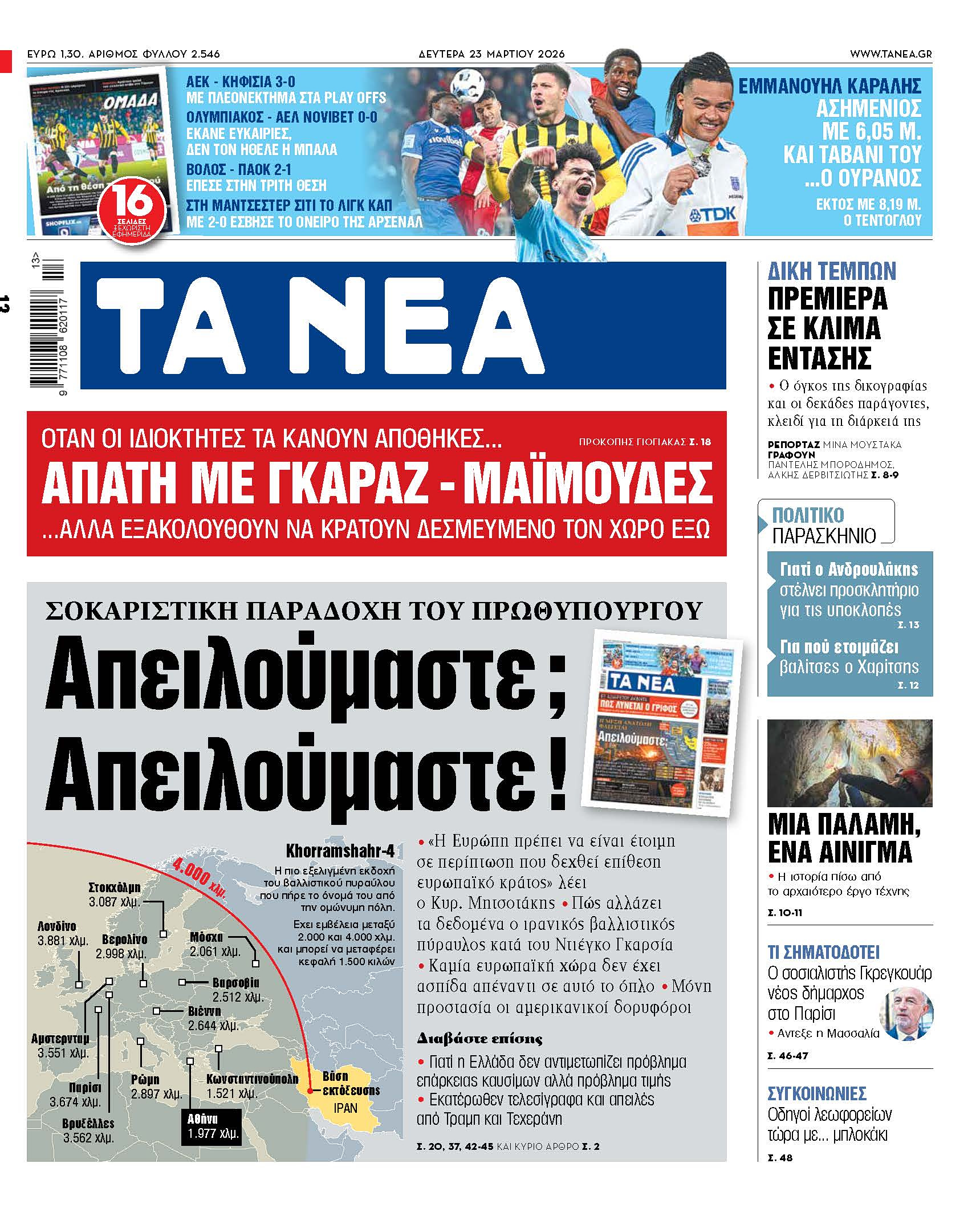 Media#Τα ΝΕΑΔιαβάστε στα «ΝΕΑ» της Δευτέρας: Απειλούμαστε; Απειλούμαστε!Σοκαριστική παραδοχή του πρωθυπουργού TANEA Newsroom 23/03/2026, 00:10 Share Share Facebook Twitter Linked in Messenger Whatsapp Telegram e-mail Τελευταία Νέα 00:42 Ελλάδα Καρυστιανού για Τέμπη: Η Νέμεσις και η Τίσις κοντοζυγώνουν 00:19 Ποδόσφαιρο Ρεάλ Μαδρίτης – Ατλέτικο Μαδρίτης 3-2: Mε πρωταγωνιστή Βινίσιους το έφερε… τούμπα και έμεινε «ζωντανή» 00:10 Media Διαβάστε στα «ΝΕΑ» της Δευτέρας: Απειλούμαστε; Απειλούμαστε! 00:07 Αλλα αθλήματα Volley League Γυναικών: Νίκησαν Παναθηναϊκός, Ολυμπιακός – Τα ζευγάρια των πλέι οφΔιαβάστε στα «ΝΕΑ» της Δευτέρας: Απειλούμαστε; Απειλούμαστε! Σχόλια Περισσότερα σχόλια Γράψτε το σχόλιό σας Απάντηση σε parentID Όνομα 50 /50 Το πεδίο είναι υποχρεωτικό Σχόλιο 2000 /2000 Το πεδίο είναι υποχρεωτικό Post ID Post Title Υποβολή σχολίου Όροι Χρήσης. Το site προστατεύεται από reCAPTCHA, ισχύουν Πολιτική Απορρήτου & Όροι Χρήσης της Google. Τελευταία ΝέαΚαρυστιανού για Τέμπη: Η Νέμεσις και η Τίσις κοντοζυγώνουνΡεάλ Μαδρίτης – Ατλέτικο Μαδρίτης 3-2: Mε πρωταγωνιστή Βινίσιους το έφερε… τούμπα και έμεινε «ζωντανή»Διαβάστε στα «ΝΕΑ» της Δευτέρας: Απειλούμαστε; Απειλούμαστε!