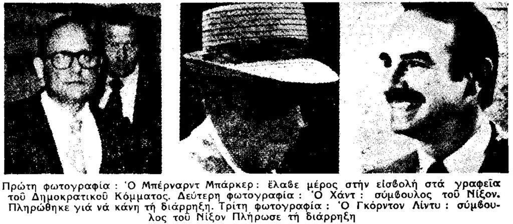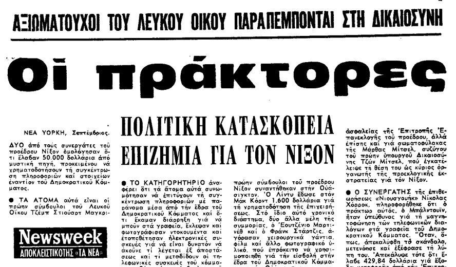 «Δύο από τους συνεργάτες του προέδρου Νίξον ομολόγησαν ότι έλαβαν 50.000 δολλάρια από μυστική πηγή, προκειμένου να χρηματοδοτήσουν τη συγκέντρωση πληροφοριών και στοιχείων εναντίον του Δημοκρατικού Κόμματος».
