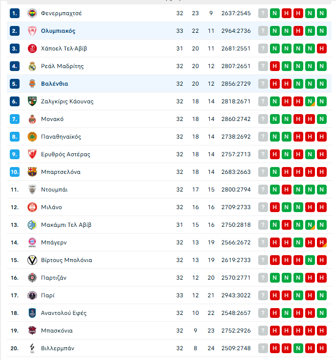 Η τελευταία κούρσα της Euroleague είναι εδώ. Ο Ολυμπιακός (22-11) θέλει να «τελειώσει» την δουλειά στην Ισπανία κόντρα στην Βαλένθια (20-12) για την 33η αγωνιστική της Euroleague στην «Roig Arena» (24/03 21:30, Novasports Prime) και να «αγκαλιάσει» την πρώτη τετράδα.