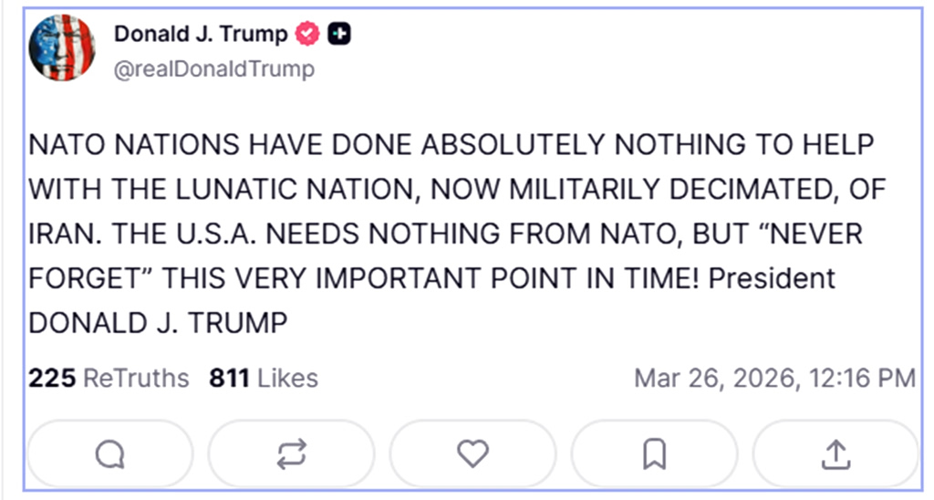Ο Πρόεδρος των ΗΠΑ Ντόναλντ Τραμπ, εξαπέλυσε νέα επίθεση κατά των χωρών του ΝΑΤΟ, κατηγορώντας τες ότι «δεν έχουν κάνει απολύτως τίποτα» για να βοηθήσουν στο Ιράν. Οι δηλώσεις του Αμερικανού προέδρου έγιναν μέσω ανάρτησής του στην πλατφόρμα Truth Social.