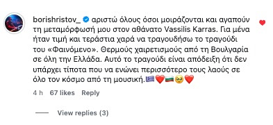 Ευχαριστώ όλους όσοι μοιράζονται και αγαπούν τη μεταμόρφωσή μου στον αθάνατο Vassilis Karras. Για μένα ήταν τιμή και τεράστια χαρά να τραγουδήσω το τραγούδι του «Φαινόμενο». Θερμούς χαιρετισμούς από τη Βουλγαρία σε όλη την Ελλάδα. Αυτό το τραγούδι είναι απόδειξη ότι δεν υπάρχει τίποτα που να ενώνει περισσότερο τους λαούς σε όλο τον κόσμο από τη μουσική.🇬🇷