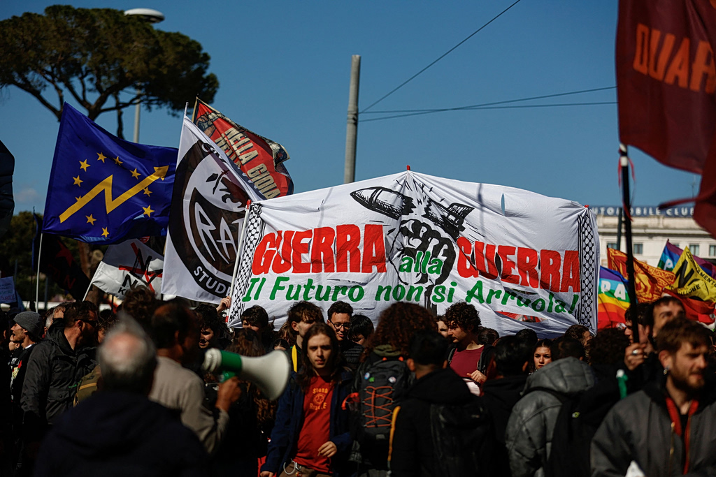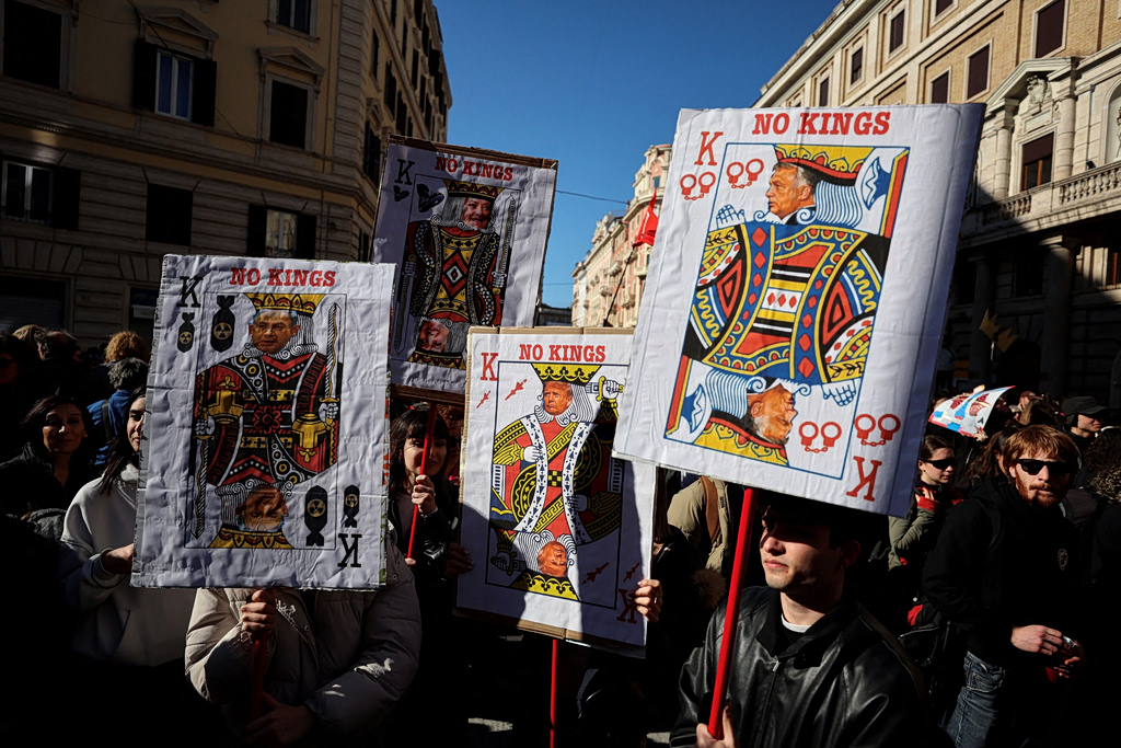 Στη Ρώμη, διαδηλωτές ύψωσαν ένα τεράστιο πανό με το σύνθημα «Για έναν κόσμο ελεύθερο από τον πόλεμο» στα ιταλικά. Στο Παρίσι, χειροποίητο πλακάτ έγραφε «No Kings» στα γαλλικά, ενώ στη Μαδρίτη μια γυναίκα κρατούσε πινακίδα που ανέφερε «Η εξουσία στον λαό» στα ισπανικά.