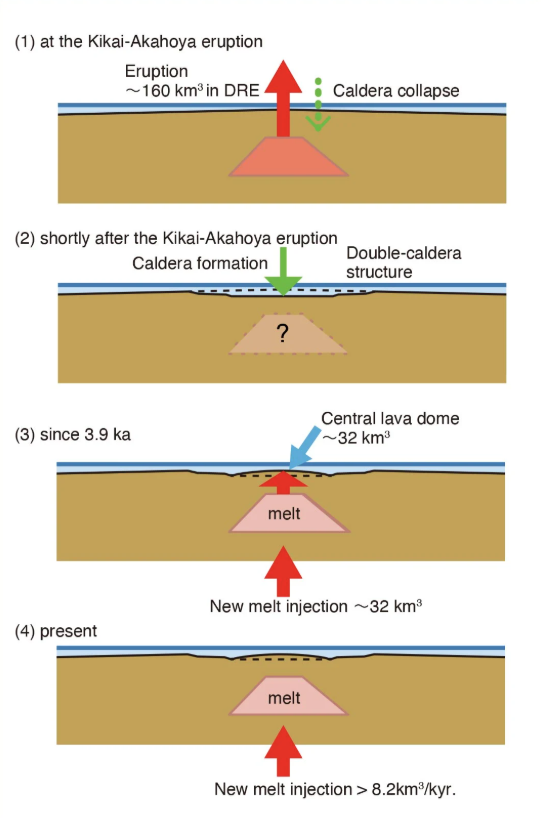 Ωστόσο, το μάγμα που υπάρχει σήμερα δεν φαίνεται να είναι υπόλειμμα της παλιάς έκρηξης. Οι επιστήμονες είχαν ήδη εντοπίσει ότι τα τελευταία 3.900 χρόνια σχηματίζεται ένας νέος θόλος λάβας στο κέντρο της καλντέρας. Οι χημικές αναλύσεις δείχνουν ότι αυτό το υλικό διαφέρει από εκείνο της αρχικής έκρηξης. «Αυτό σημαίνει ότι το μάγμα που υπάρχει τώρα κάτω από τον θόλο λάβας είναι πιθανότατα νεοεισερχόμενο», συνοψίζει ο Seama. Τα ευρήματα αυτά στηρίζουν ένα γενικότερο μοντέλο για το πώς επαναγεμίζουν οι ταμιευτήρες μάγματος κάτω από τις καλντέρες.