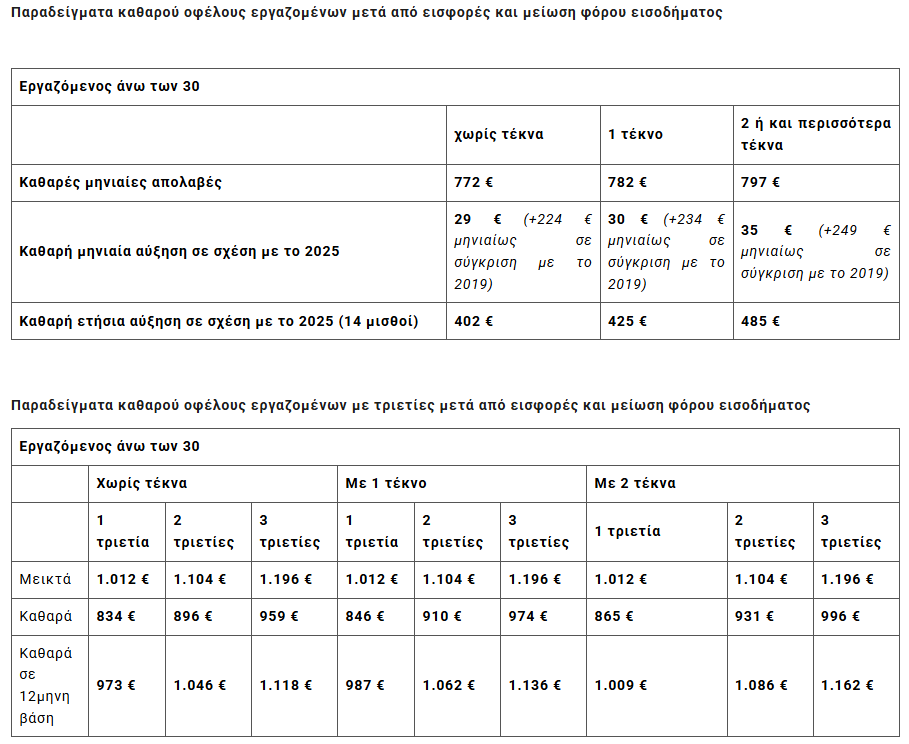 · Το ημερομίσθιο των εργατοτεχνιτών από 39,30 ευρώ σε 41,09 ευρώ, ενώ στα μισθολογικά κλιμάκια του Δημοσίου κατά 40 ευρώ, μετά την αύξηση των 30 ευρώ το 2025 και την οριζόντια αύξηση των 70 ευρώ το 2024.