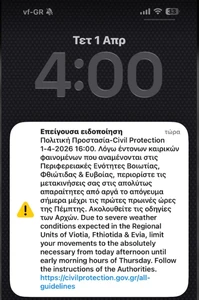 Νέο μήνυμα 112 από την υπηρεσία Κλιματικής Κρίσης και Πολιτικής Προστασίας, στους κατοίκους των περιφερειακών ενοτήτων Βοιωτίας, Φθιώτιδας και Εύβοιας. Καλούνται να περιορίσουν τις μετακινήσεις τους λόγω των έντονων καιρικών φαινομένων που αναμένονται.