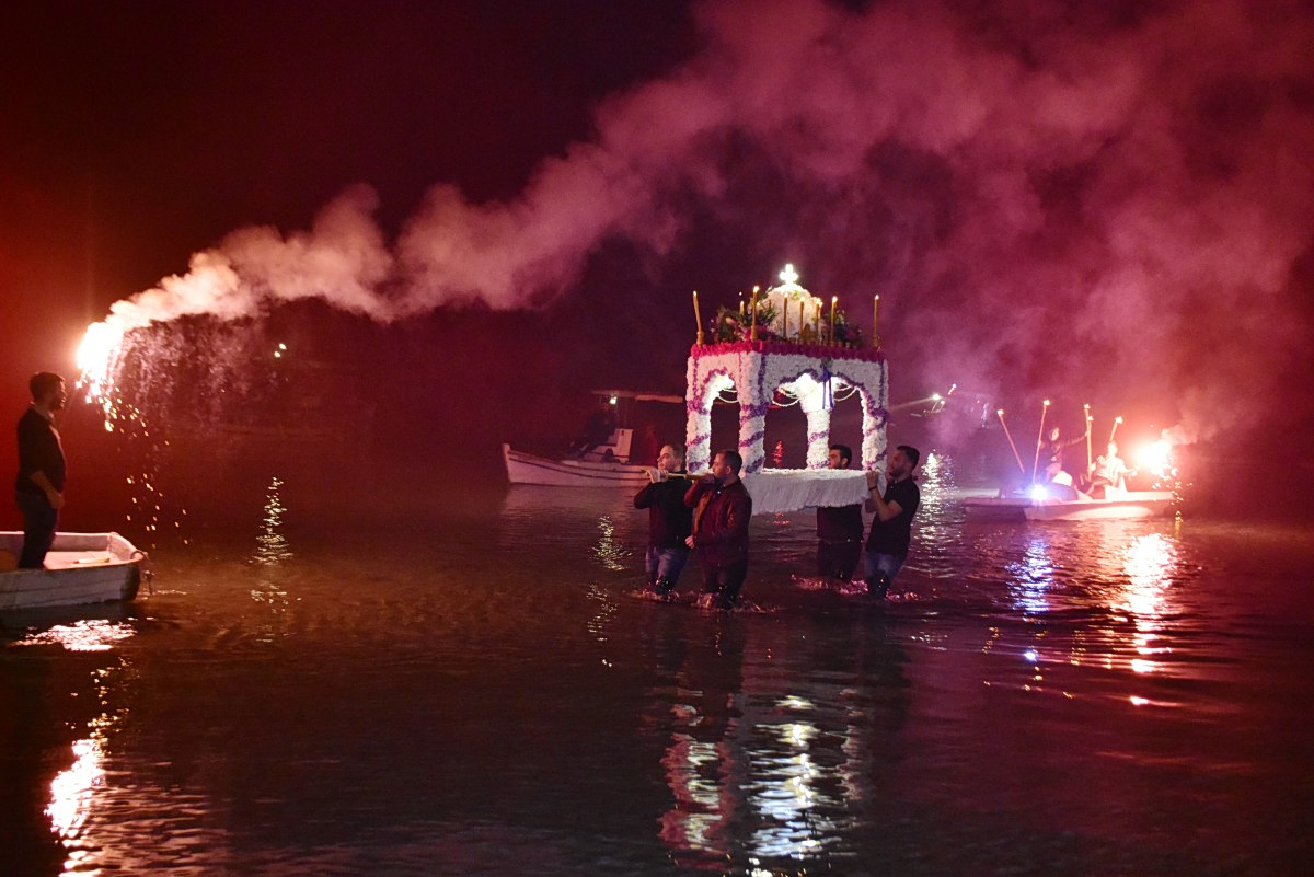Η στιγμή είναι ιδιαίτερη. Ο Επιτάφιος καταλήγει στην παραλία και μεταφέρεται μέσα στο νερό από νέους της περιοχής. Το φως από τα κεριά αντανακλάται στο νερό και δίνει άλλη διάσταση στην περιφορά. Δεν υπάρχει ένταση. Υπάρχει μια ηρεμία που σε κρατά εκεί, ακόμα κι αν δεν το περιμένεις.