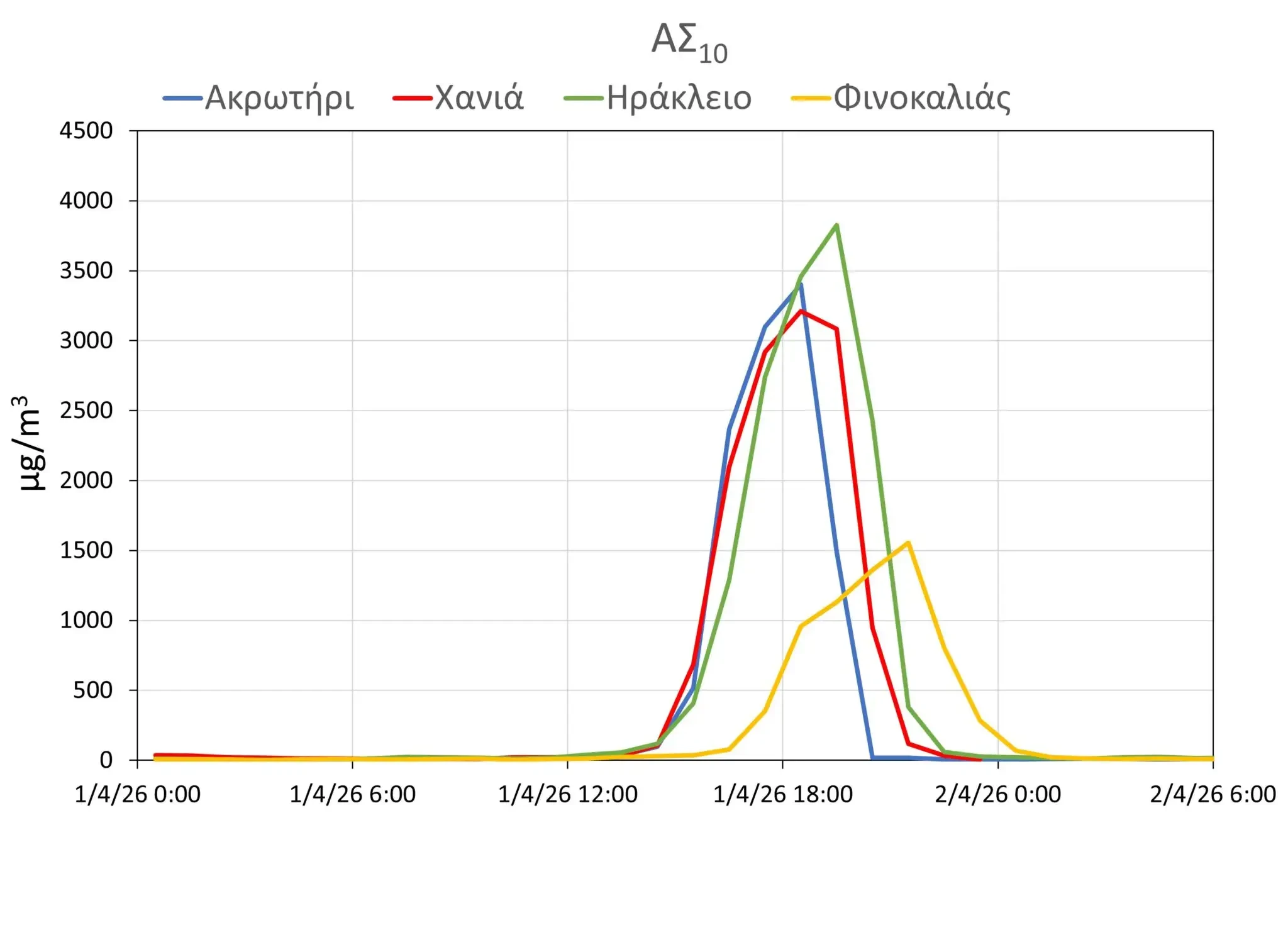Οι μέγιστες ωριαίες συγκεντρώσεις που καταγράφηκαν ήταν ιδιαίτερα υψηλές: 3.211 μg/m³ στα Χανιά, 3.402 μg/m³ στο Ακρωτήρι, 3.826 μg/m³ στο Ηράκλειο και 1.555 μg/m³ στη Φινοκαλιά. Σημειώνεται ότι το όριο για την προστασία της ανθρώπινης υγείας είναι τα 50 μg/m³ (μέση ημερήσια τιμή), με τις τιμές να ξεπερνούν κατά πολύ – ακόμη και δεκαπλάσια – τα επιτρεπτά επίπεδα σε ολόκληρη την Κρήτη.