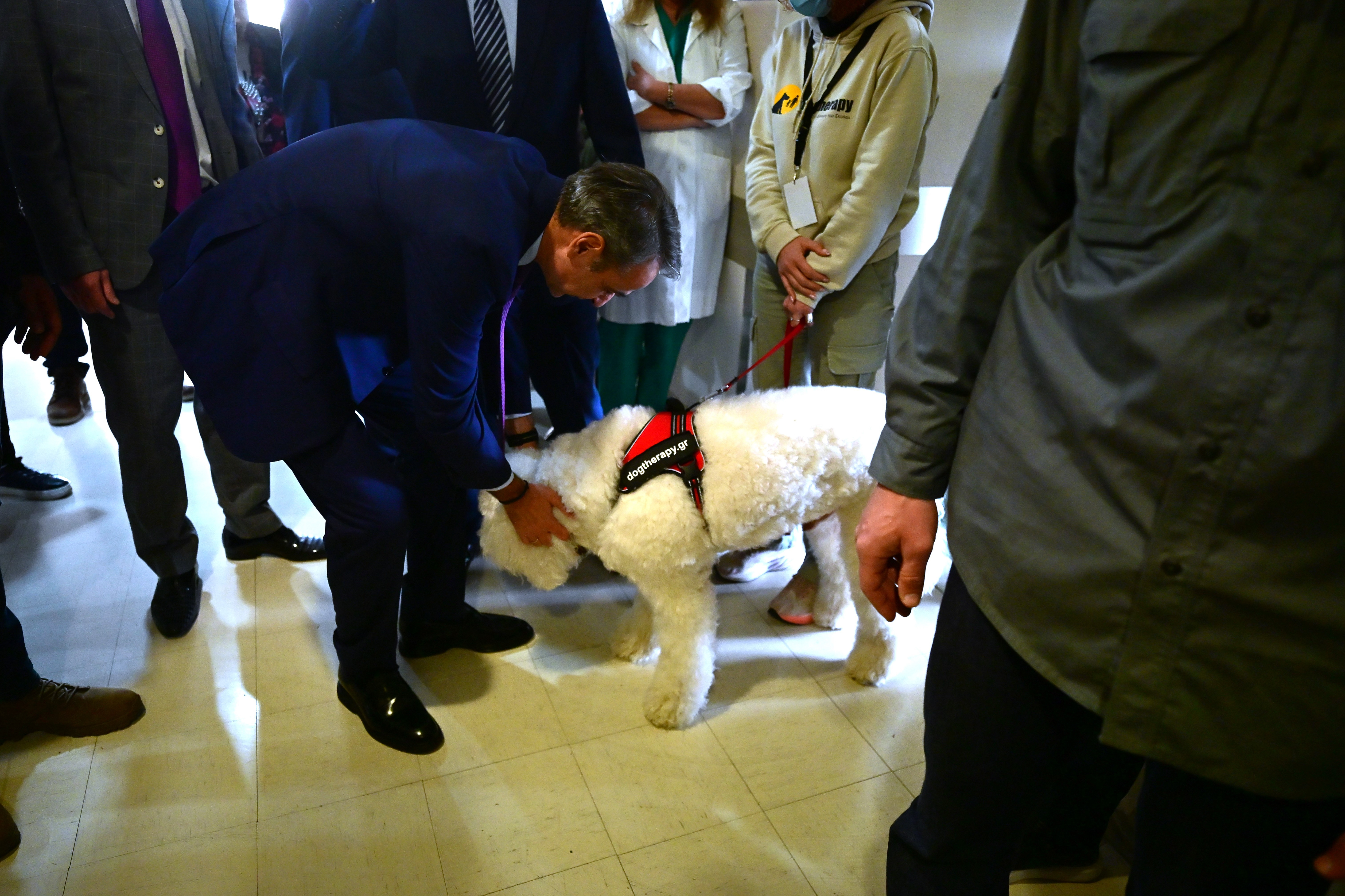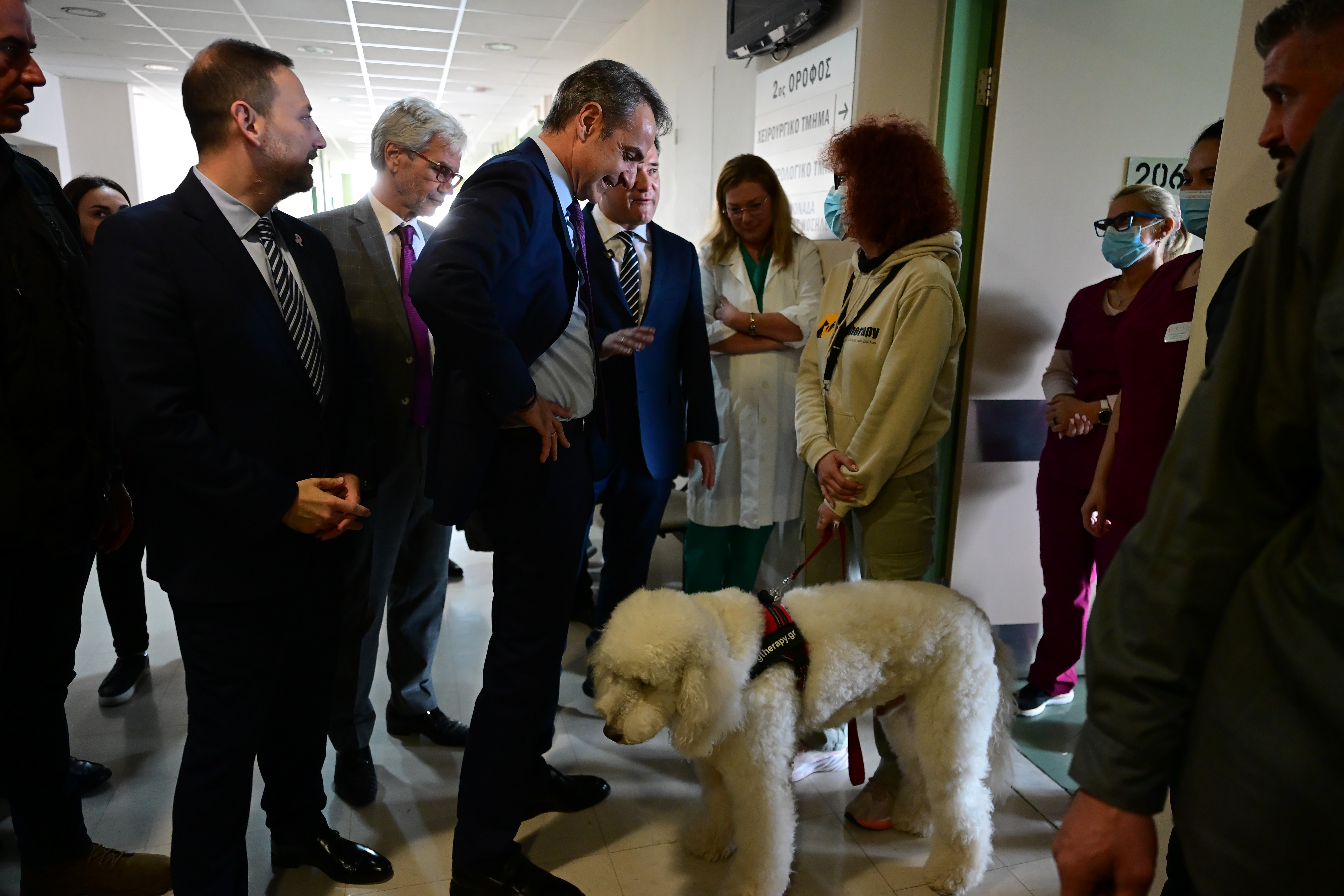 Η «συνάντηση» του Κυριάκου Μητσοτάκη με τον τετράποδο «βοηθό» γιατρών και νοσηλευτών πραγματοποιήθηκε σε διάδρομο του νοσοκομείου, κατά τη διάρκεια της περιήγησής του στους χώρους του ιδρύματος. Η εικόνα αυτή προσέδωσε ανθρώπινη διάσταση στην επίσκεψη, αναδεικνύοντας τη σημασία της ψυχολογικής φροντίδας στην ογκολογική περίθαλψη.
