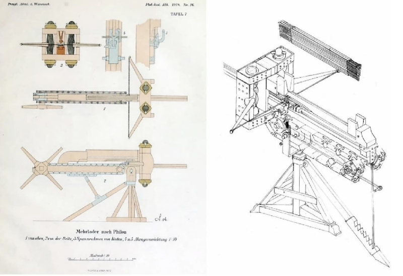 Ο Φίλων περιγράφει λεπτομερώς τον μηχανισμό οδοντωτών τροχών που κινούσε μια αλυσιδοκίνητη διάταξη για την αυτόματη τοποθέτηση των βελών στη θέση εκτόξευσης — την αρχαιότερη γνωστή εφαρμογή τέτοιου συστήματος.
