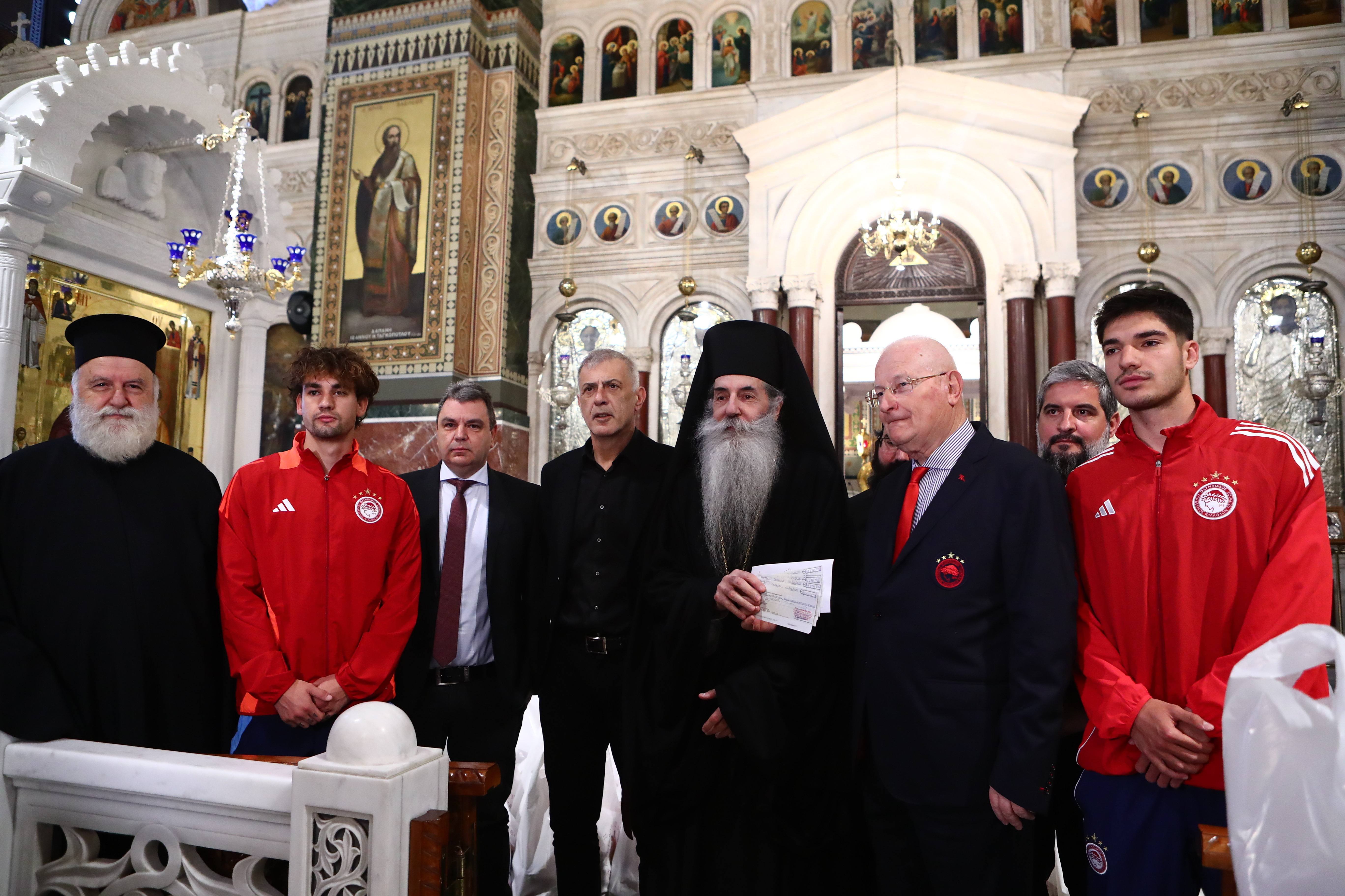 «Εάν αυτή τη στιγμή γύριζε ο φακός θα βλέπατε εδώ εκατοντάδες ανθρώπους να περιμένουν να πάρουν τα δέματα αγάπης του Σεβασμιότατου Μητροπολίτη μας κ. κ. Σεραφείμ. Ο κύριος Βαγγέλης Μαρινάκης μη φειδόμενος χρημάτων για άλλη μία φορά και αν δείτε, αυτή τη στιγμή παραδίδονται δέματα από την ΠΑΕ Ολυμπιακός στο Κοινωνικό Παντοπωλείο του Δήμου Πειραιά, 150 δέματα. Ταυτόχρονα, αυτή τη στιγμή παραδίδω στον Δέσποτα μια επιταγή του κύριου Βαγγέλη Μαρινάκη για το πασχαλινό γεύμα. Ταυτόχρονα, 1,5 τόνο κρέατα, 150 αρνιά διατίθενται για τους πένητες. Η ακρίβεια μαστίζει τα νοικοκυριά, γι΄αυτό και ο κύριος Βαγγέλης Μαρινάκης προσφέρει πλουσιοπάροχα δέματα. Μαζί μας είναι και νέα παιδιά, ποδοσφαιριστές του Ολυμπιακού που δίνουν τα δέματα. Ταυτόχρονα δίνουμε και 5 επιταγές της μισθοδοσίας του Μαρτίου για τους αμίσθους Ιερομονάχους που δεν τους δεν τους μπορεί να τους πληρώσει η μισθοδοσία του Δημοσίου. Δόξα σοι ο Θεός, να τον έχει καλά τον κύριο Βαγγέλη Μαρινάκη».
