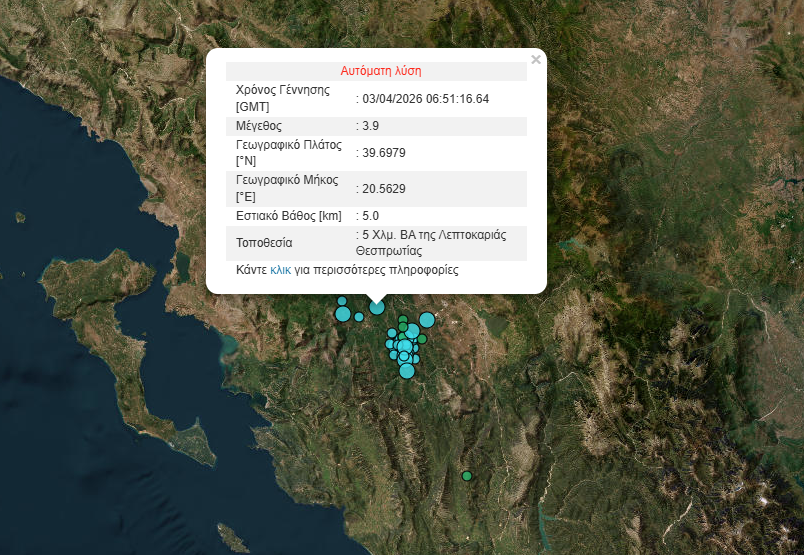Σεισμική δόνηση μεγέθους 3,9 Ρίχτερ σημειώθηκε το πρωί της Παρασκευής ( 3 Απριλίου 2026) στην περιοχή της Θεσπρωτίας.