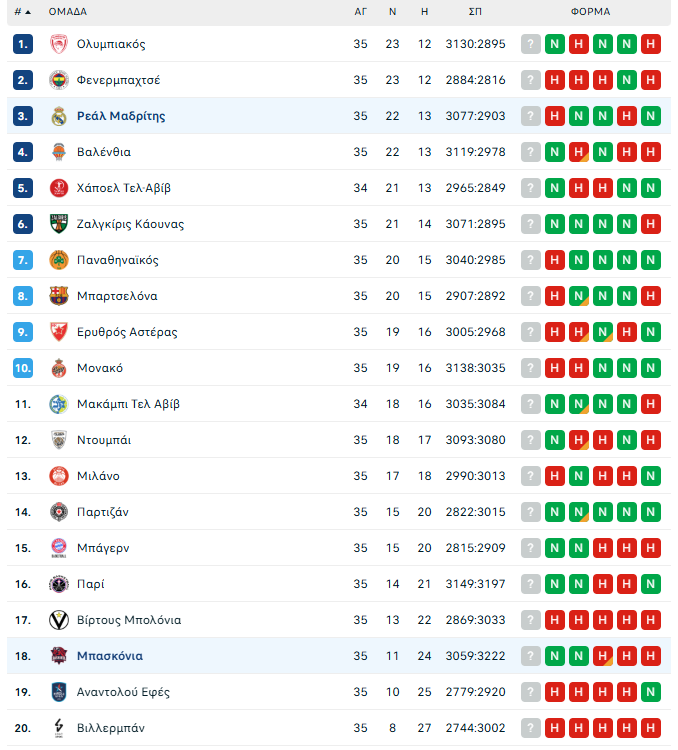 Στις άλλες δύο αναμετρήσεις τις βραδιάς, η Mπασκόνια νίκησε την Ρεάλ Μαδρίτης στον ισπανικό «εμφύλιο» της 35ης αγωνιστικής με 98-96, ενώ η Βαλένθια πήρε «διπλό» στην έδρα της Βίρτους Μπολόνια με 94-81, κάτι που μπορεί να την οδηγήσει στο να έχει το προβάδισμα έδρας στα Play-Offs που θα δώσουν τα 4 εισιτήρια για το Final Four της Αθήνας.
