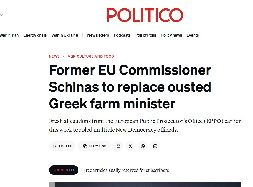 Σύμφωνα με το Politico, η ευρωπαϊκή διάσταση της υπόθεσης θεωρείται κρίσιμη, καθώς ο πρώην αντιπρόεδρος της Ευρωπαϊκής Επιτροπής Μαργαρίτης Σχοινάς αναμένεται να αναλάβει το Υπουργείο Αγροτικής Ανάπτυξης, στη θέση του Κώστα Τσιάρα. Η επιλογή αυτή εκλαμβάνεται ως προσπάθεια ενίσχυσης της αξιοπιστίας της κυβέρνησης απέναντι στις Βρυξέλλες.