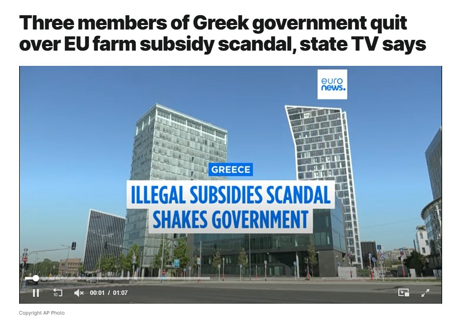 Σύμφωνα με την Washington Post ότι τρεις κορυφαίοι υπουργοί υπέβαλαν την παραίτησή τους εν μέσω έρευνας της Ευρωπαϊκής Ένωσης για φερόμενη απάτη στις επιδοτήσεις. Πρόκειται για τον υπουργό Αγροτικής Ανάπτυξης Κώστα Τσιάρα, τον υπουργό Πολιτικής Προστασίας Γιάννη Κεφαλογιάννη και τον υφυπουργό Υγείας Δημήτρη Βαρτζόπουλο. Και οι τρεις αρνήθηκαν κάθε παρανομία, δηλώνοντας πως αποχωρούν για να διευκολύνουν τη δικαστική διαδικασία.