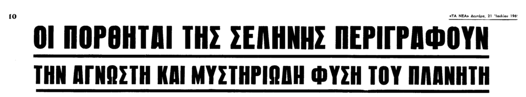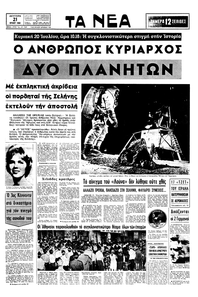 Πάνω στο πρωτοσέλιδο των ΝΕΩΝ της Δευτέρας 21 Ιουλίου 1969, αναγράφετε «Κυριακή 20 Ἰουλίου, ὥρα 10.18: Ἡ συγκλονιστικώτερη στιγμή στήν Ἱστορία – Ο ΑΝΘΡΩΠΟΣ ΚΥΡΙΑΡΧΟΣ ΔΥΟ ΠΛΑΝΗΤΩΝ – Μέ έκπληκτική ἀκρίβεια οἱ πορθηταί τῆς Σελήνης ἐκτελοῦν τήν ἀποστολή».