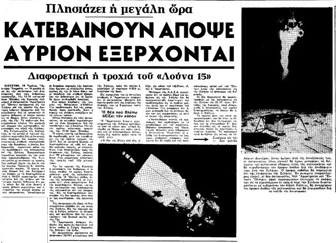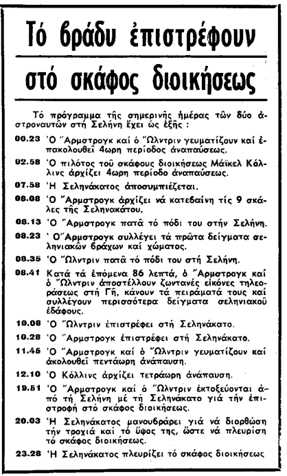 «Ολόκληρη η Αθήνα παρακολούθησε χθές το βράδυ και σήμερα το πρωί ἀπό τις ὁθόνες της τηλεοράσεως και από το ραδιόφωνο την περιγραφή της μεγάλης διαστημηκής εποποιήας. Κάθε σπίτι που διέθετε οθόνη τηλεοράσεως είχε κατακλυσθή από επισκέπτες. Στις κεντρικές πλατείες πλήθη κόσμου συνέρρευσανμπροστά στις οθόνες πλήν όμως δεν μπόρεσαν να ζήσουν παρά μόνο νοερά τη μεγάλη στιγμή της προσσεληνώσεως γιατί δεν επετεύχθη επαφή με το Χιούστον πράγμα που εδημιούργησε σύγχυση, αμφιβολία και αγωνία».