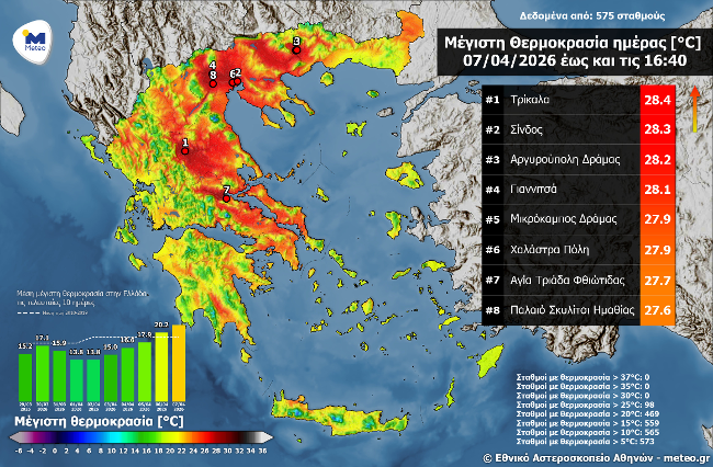 Σύμφωνα με τα στοιχεία του Meteo, η υψηλότερη θερμοκρασία της Μεγάλης Τρίτης καταγράφηκε στα Τρίκαλα, όπου ο υδράργυρος έφτασε τους 28,4 βαθμούς Κελσίου.