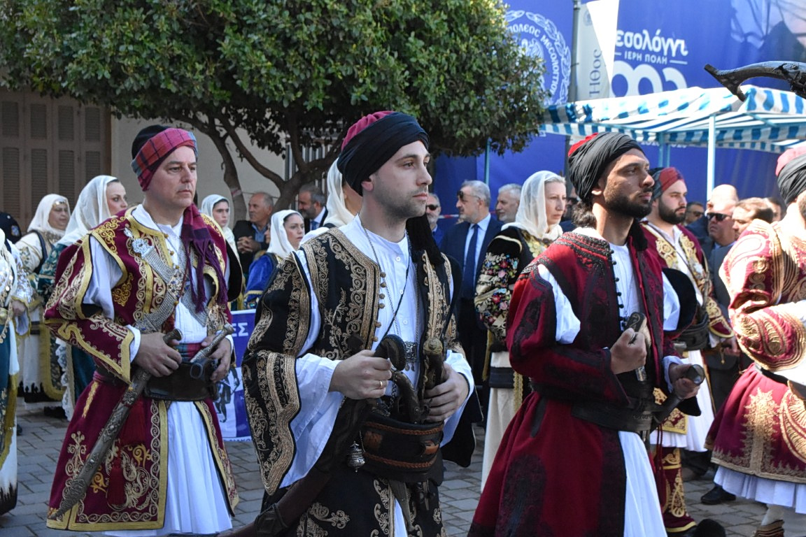 Η ατμόσφαιρα στον Κήπο των Ηρώων γέμισε σεβασμό και συγκίνηση με την κατάθεση στεφάνων από εκπροσώπους της Πολιτείας, τιμώντας τους Αθάνατους Πολιορκημένους και την ηρωική τους αυτοθυσία. Αμέσως μετά, η φωνή του Νίκου Αλιάγα αντήχησε σε δύο γλώσσες, ελληνικά και γαλλικά, γεφυρώνοντας παρελθόν και παρόν και τιμώντας με μοναδικό τρόπο τη Γαλλία, τιμώμενη χώρα της φετινής Επετείου.