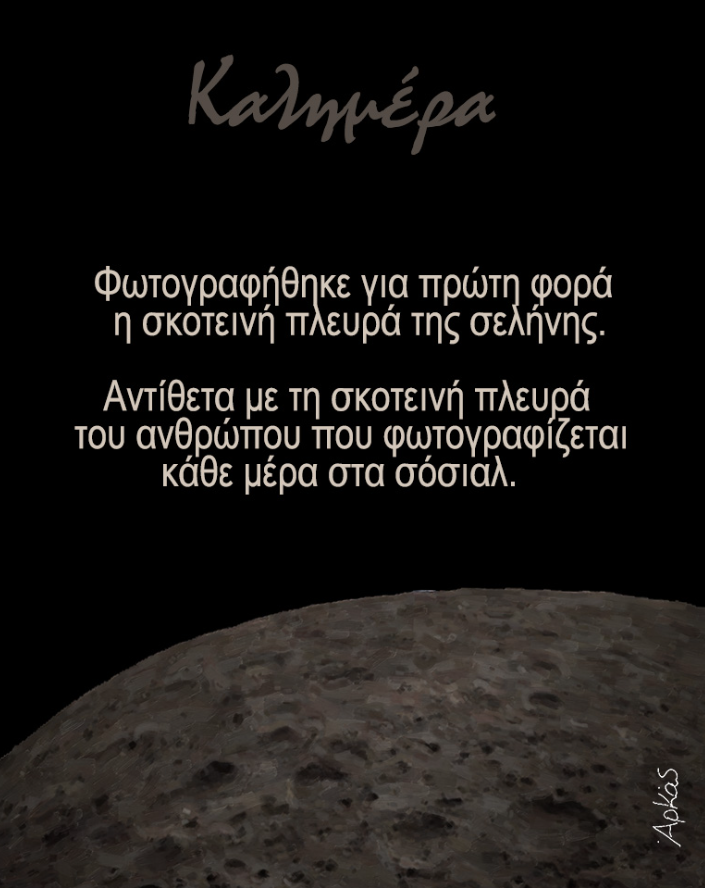 Στο νέο του έργο, ο γνωστός δημιουργός χρησιμοποιεί τη «σκοτεινή πλευρά της σελήνης» ως αφορμή για ένα σχόλιο που ξεφεύγει από την επιστημονική είδηση και καταλήγει στον άνθρωπο. Το κείμενο του σκίτσου αντιπαραβάλλει την πρώτη φωτογράφηση της αθέατης πλευράς της Σελήνης με τη «σκοτεινή πλευρά» του ίδιου του ανθρώπου, η οποία –όπως υπαινίσσεται– προβάλλεται καθημερινά στα μέσα κοινωνικής δικτύωσης.